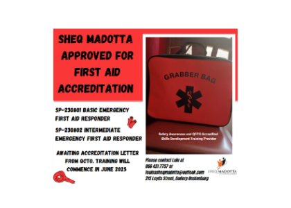 UncategorizedSHEQ Madotta Approved for First Aid Accreditation (Awaiting Accreditation Letter from QCTO) May 8, 2025 louisaComment on SHEQ Madotta Approved for First Aid Accreditation (Awaiting Accreditation Letter from QCTO)